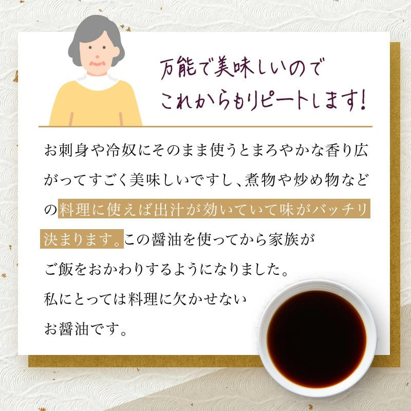 鰹だしと昆布だしをバランスよく組み合わせた、どんな食材にも合う、塩分控えめなマイルドなだし醤油です。