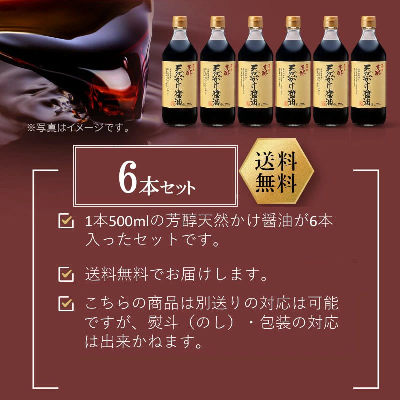 | 名称 | 【芳醇天然かけ醤油500ml 6本セット】川中醤油の看板商品 |