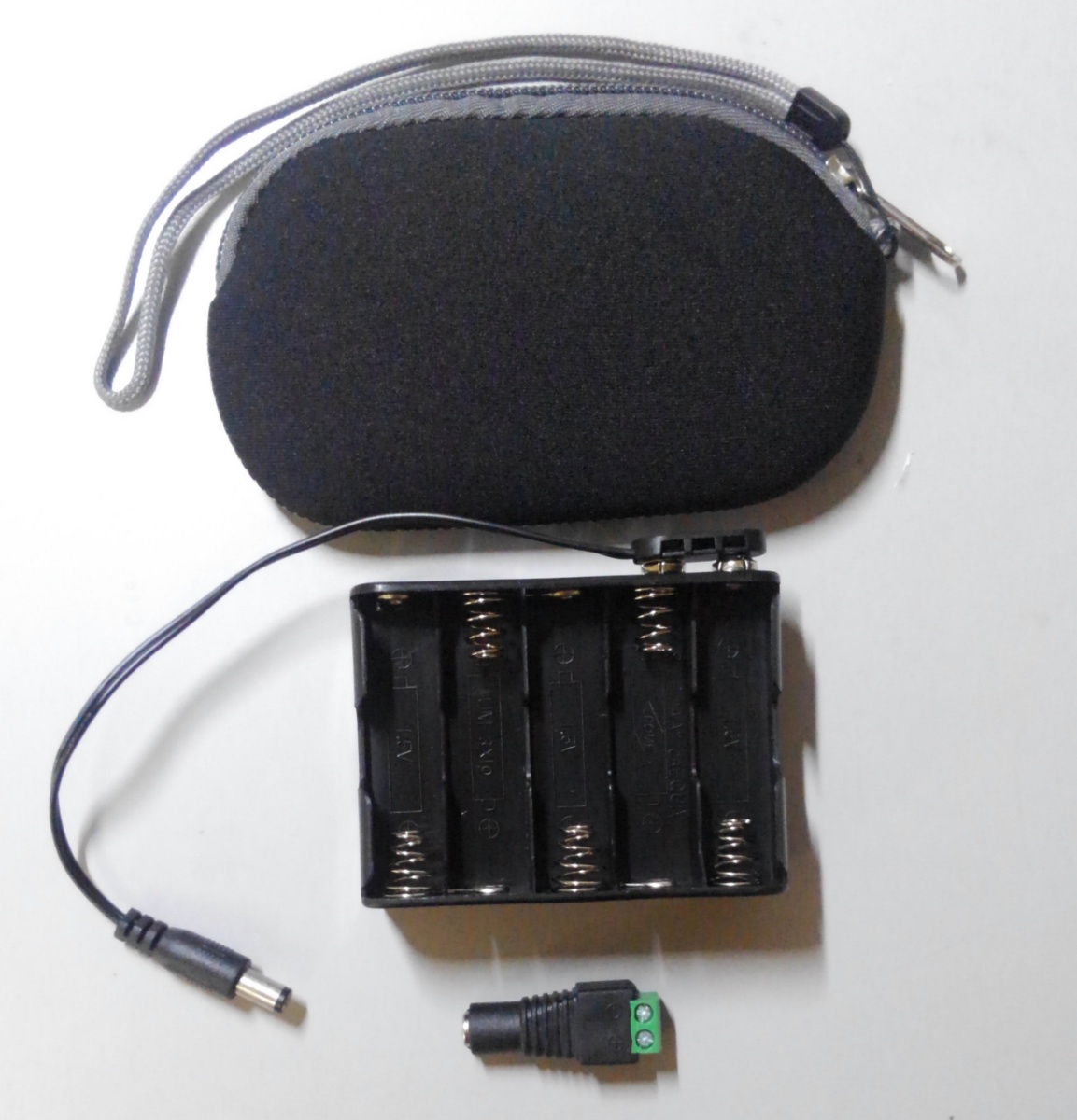 エネループなどの充電型単三型電池10本を使用して12Vを発生する電池ボックスとケース&コネクターのセットです。
