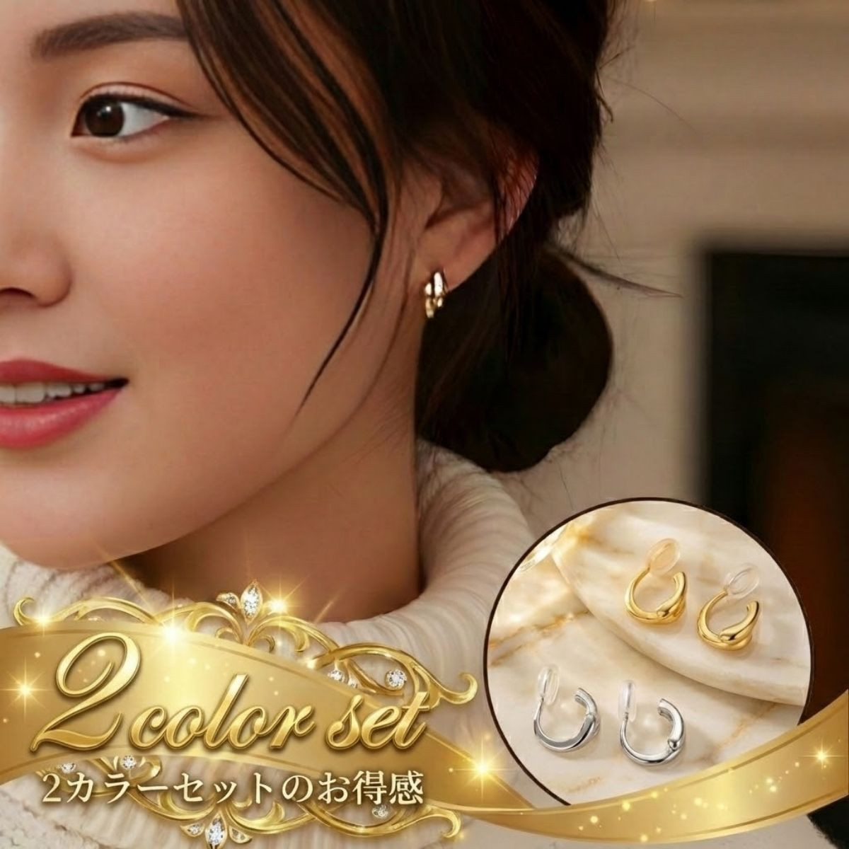 【ゴールド&シルバーの贅沢2点SET】 「今日の服にはどっちの色?」と悩む必要はありません。オンオフ使える金銀2色をセットでお届けします。結び目をモチーフにした「ノットデザイン」は、立体感がありお顔周りに知的な華やかさをプラス。18Kコーティングの贅沢な輝きが、日常をクラスアップさせます。