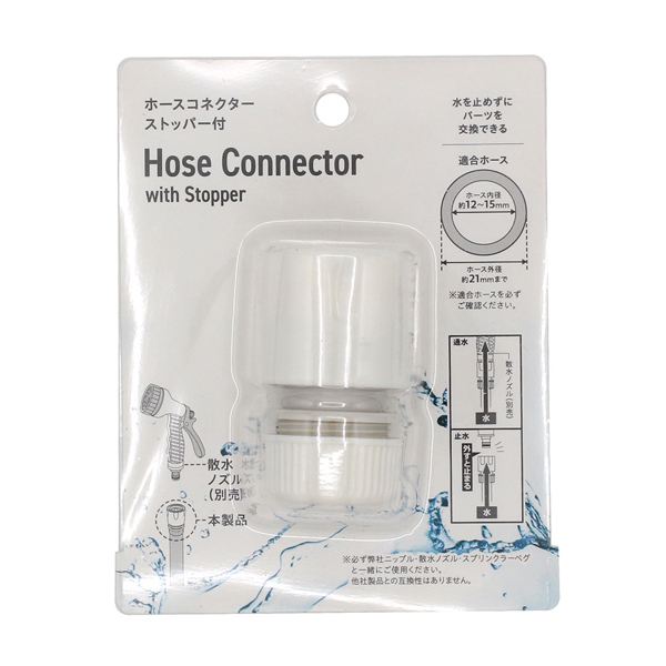 ノズルを外すと水が止まるストッパー機能付きのホースコネクターです。