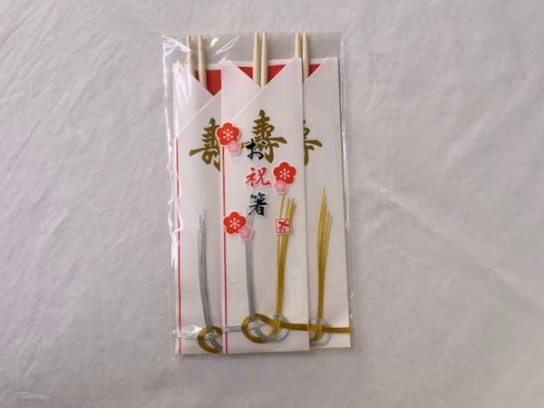 金の「壽」の入った三つ折袋に金銀の水引の付いた祝箸です。