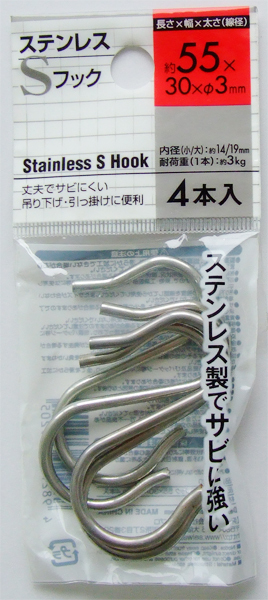 ●品名・ステンレスSフック55X30X直径3mm4本入