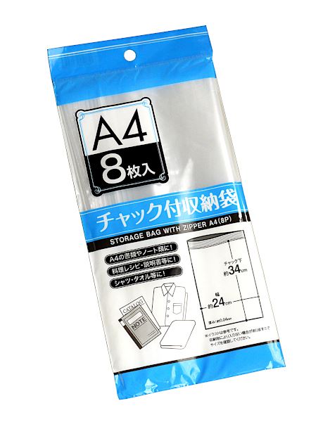 チャック付収納袋 A4サイズ収納可 34×24cm 8枚入 (100円ショップ 100円均一 100均一 100均)