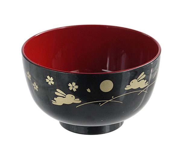 金のうさぎが映える漆塗り風の汁椀です。