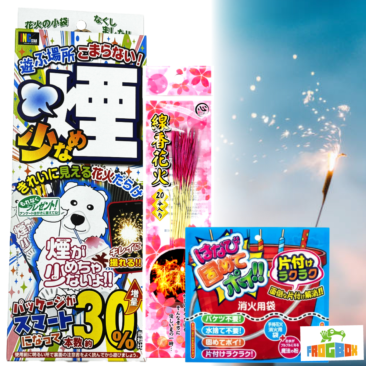 煙が少なく、持ち運ぶラクラクなコンパクト設計、ゴミを減らした環境にも優しいエコ花火の真骨頂です!