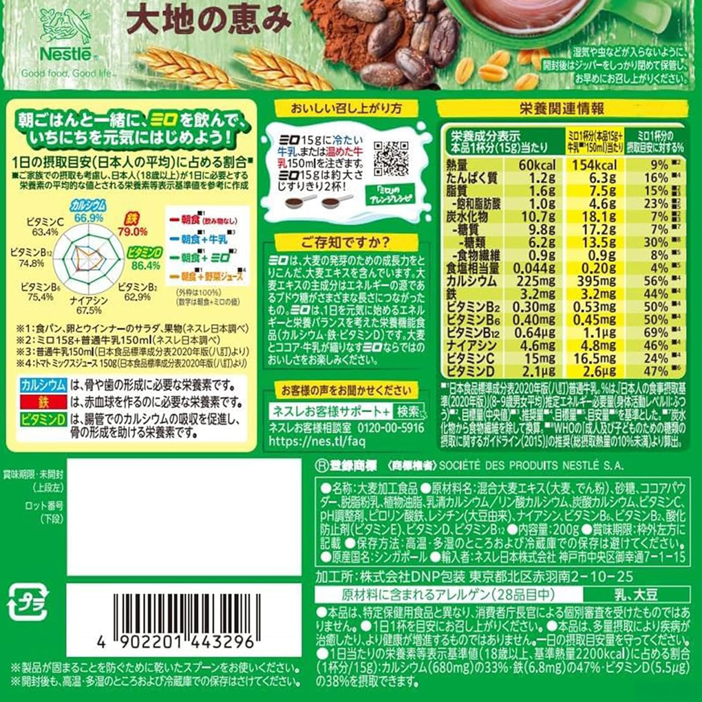 爆買 ネスレ ミロ 200g 1袋セット ココア 栄養機能食品 栄養補助 カルシウム 鉄 ビタミンD 朝食 健康サポート 栄養サポート 成長サポート 健康習慣 MILO みろ