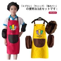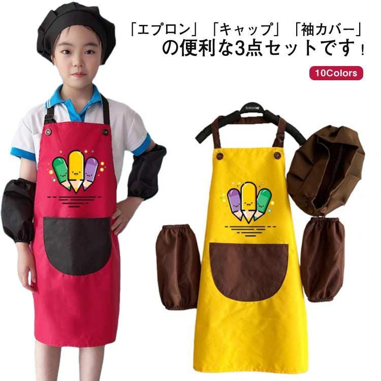 エプロン キッズ用 キャップ 袖カバー 3点セット 子供用 おしゃれ 女の子 男の子 可愛い 小学校 低学年 防水性 着脱簡単 保育園 幼稚園 調理実