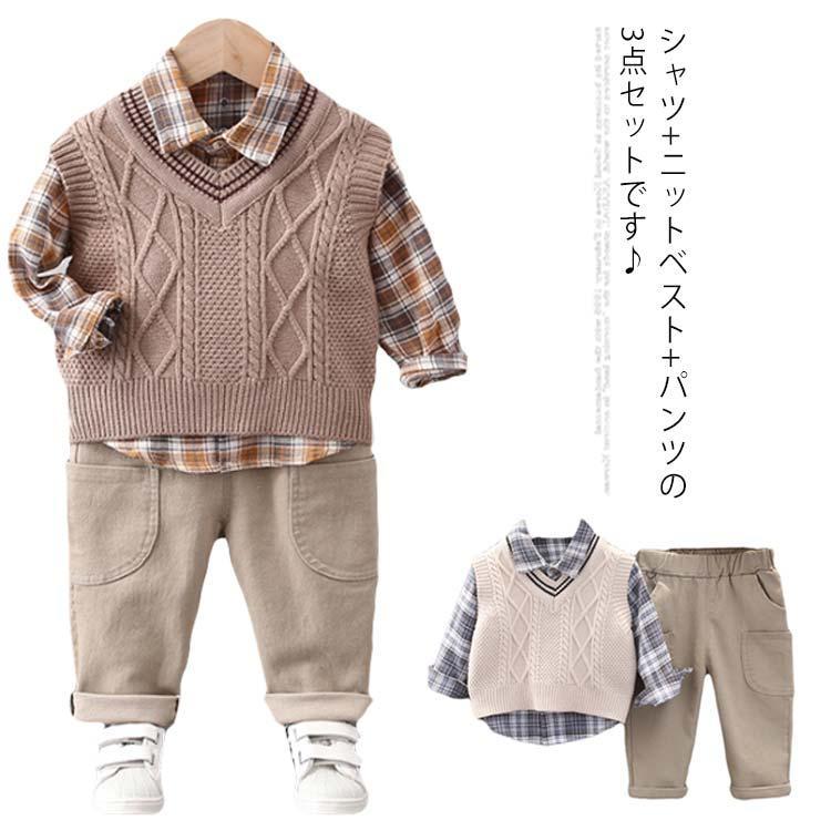 ベビー服 男の子 セットアップ 春 秋 3点セット 紳士 シャツ ニットベスト パンツ 上下セット キッズ ベビー 赤ちゃん 通園 通学 遠足 子供服