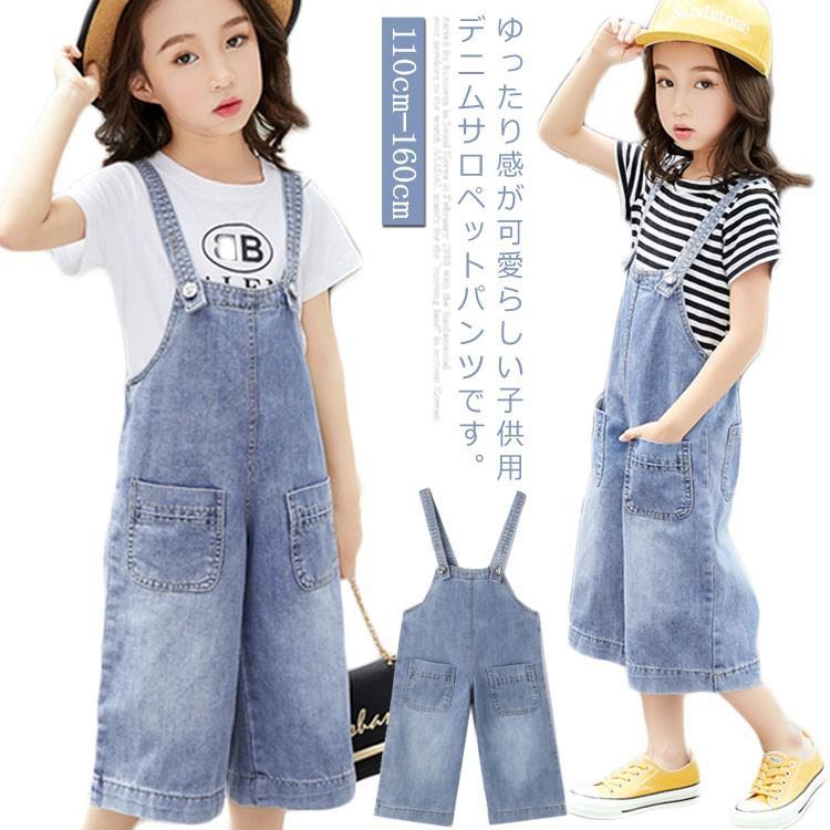 子供服 オーバーオール オールインワン デニム サロペットパンツ 女の子 ガールズ ワイドパンツ 七分丈 ジーンズ ジャンバー つなぎ服 可愛い ゆっ