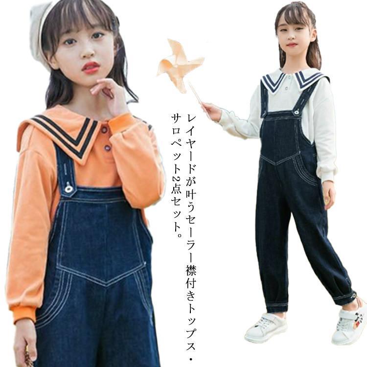 子供 長袖 上下セット サロペット セーラー襟 オーバーオール オールインワン 2点セット 長ズボン Tシャツ セーラーカラー カットソー デニム