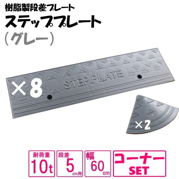 (送料無料) セット販売 樹脂製段差プレート ステッププレート 段差5cm用 幅510cm対応 耐荷重10t 樹脂製ステッププレート グレー spg-0560×8+両コーナー