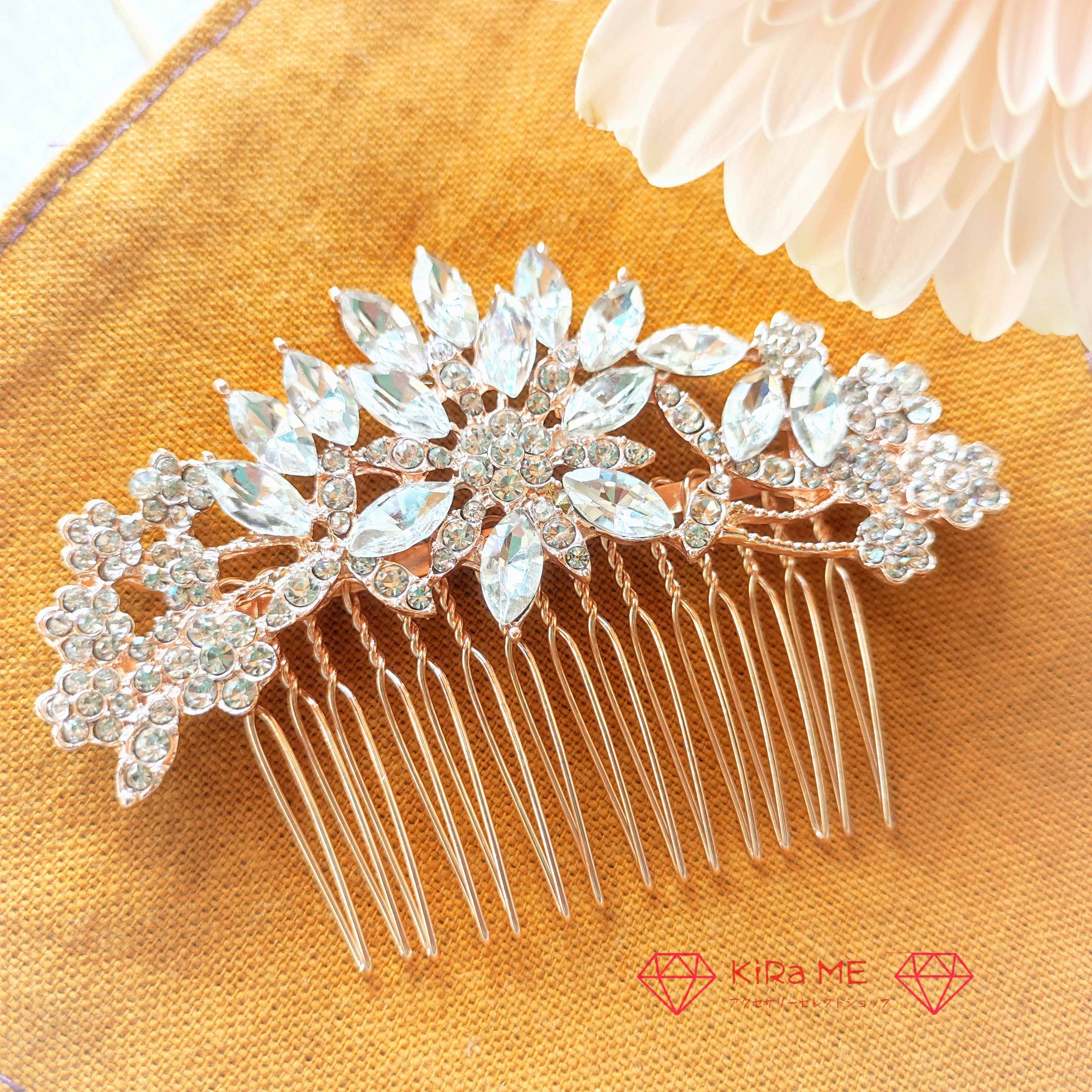 お花のモチーフに、たくさんの大粒のビジューとラインストーンでキラキラでリッチな一品。ワンランク上のお洒落なあなたを演出します。ローズゴールドの金具の色目も華やかさとフレッシュな印象の一役をかっています。結婚式、 成人式、 卒業式にと様々なフォーマルなシーンで、洋装、和装のどちらでも上品な装いに華を添えます。年齢問わずお使いいただけます。