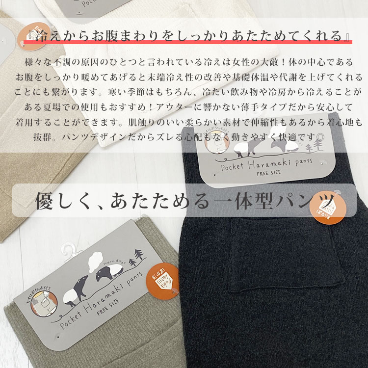 | Point | ・冷えからお腹周りをしっかり暖めてくれる腹巻パンツ♪ ・伸縮性がある柔らかい素材で、ぴったりフィットし快適! ・薄手なのでアウターにひびきにくい!パンツやスカートでも気にせず着用〇 ・カイロを入れられるポケット付きでしっかり暖めてくれます! ・寒い季節の防寒対策、暑い季節の冷房からの冷え防止に等、年中活躍。 |