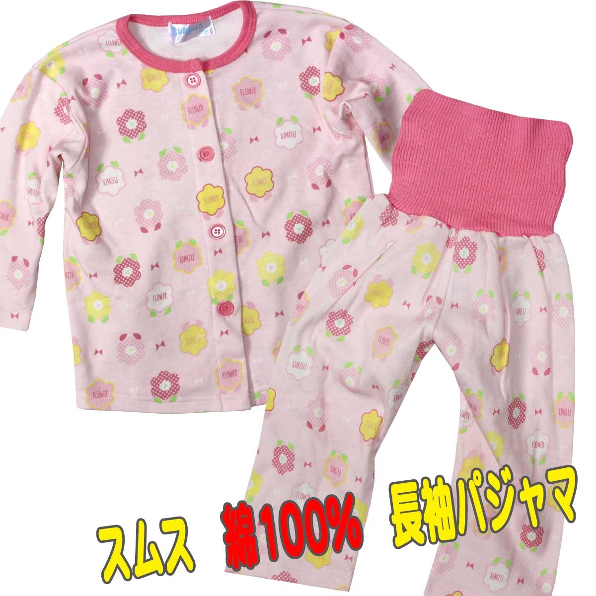 長袖パジャマ ベビー キッズ ハラマキ付 スムース 前開き 花柄 春 秋 冬 上下組 80/90/95cm 352717504-10
