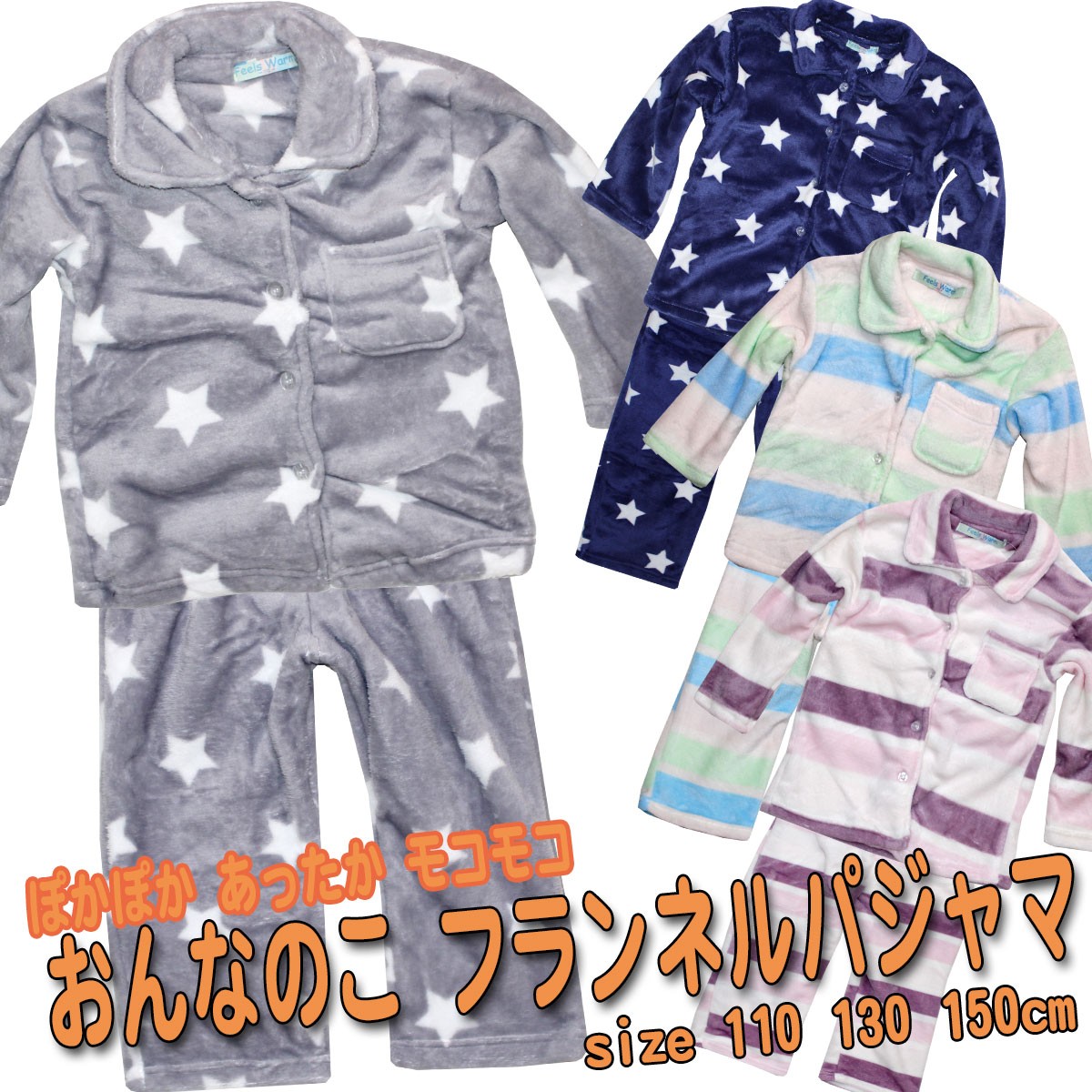 フランネル長袖パジャマ キッズ 冬 ふわもこ 上下組 前あき スター ボーダー 110cm 130cm 150cm GL-805B