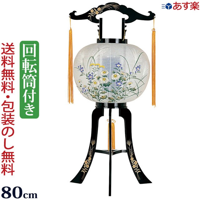 和紙張りの火袋には精細な菊桔梗の花が描かれ、骨組みにも蒔絵が施された、お値段以上に見栄えのする提灯です。 スイッチを入れると電球の熱で温められた空気で回転筒がくるくる回り、大変幻想的です。 ゆらめくあかりでご先祖様をお迎え下さい。 | |