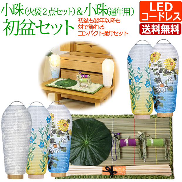 ミニ盆提灯 小珠の火袋2点セットと通年用の小珠を1台ずつに、心まちセットB(小)のセットです。初盆には白紋天と絵柄入りを対でお飾りいただき、翌年からは火袋をつけかえて絵柄入り2台で飾れる、大変お得なセットです!コンパクトサイズで場所をとらず、インテリアとしてもお使いいただけます。コードレスですので、置き場所も選びません。