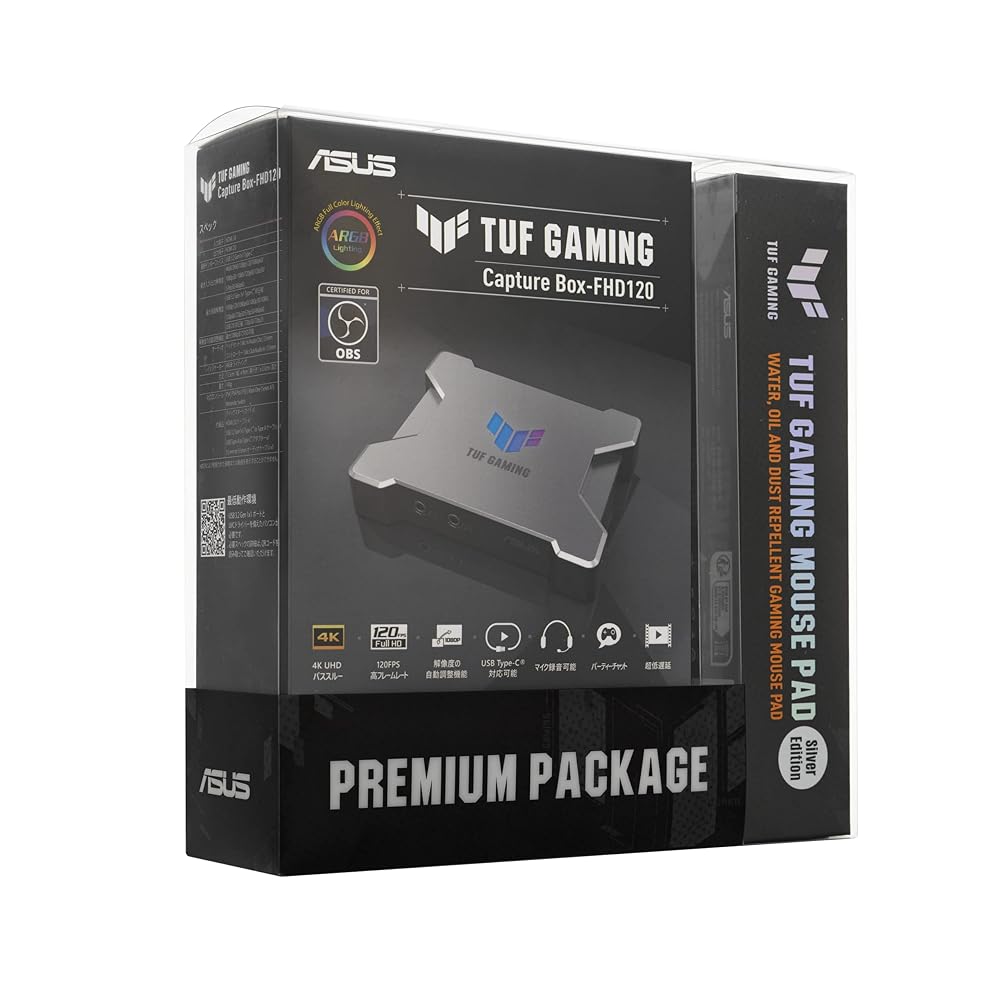 主な仕様 | 数量限定!TUFデザインのマウスパッド付き仕様最大4K(60Hz)、フルHD(120Hz)のパススルー映像に対応。OBS公式承認モデル。●オンボードスケーラーにより、ストリーミング解像度と入力解像度を自動的に同期。照明効果のカスタマイズや音量制御可能。コンパクトサイズで簡単操作のキャプチャーボックス。 |