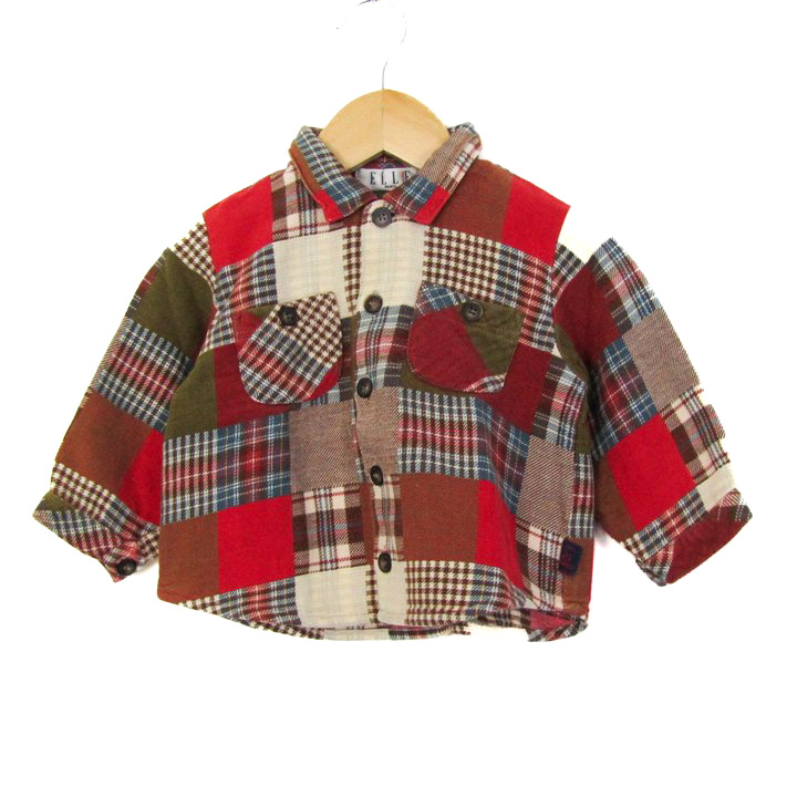 エル 長袖シャツ トップス チェック柄 パッチワーク ベビー 男の子用 80サイズ 茶×赤×ベージュ ELLE