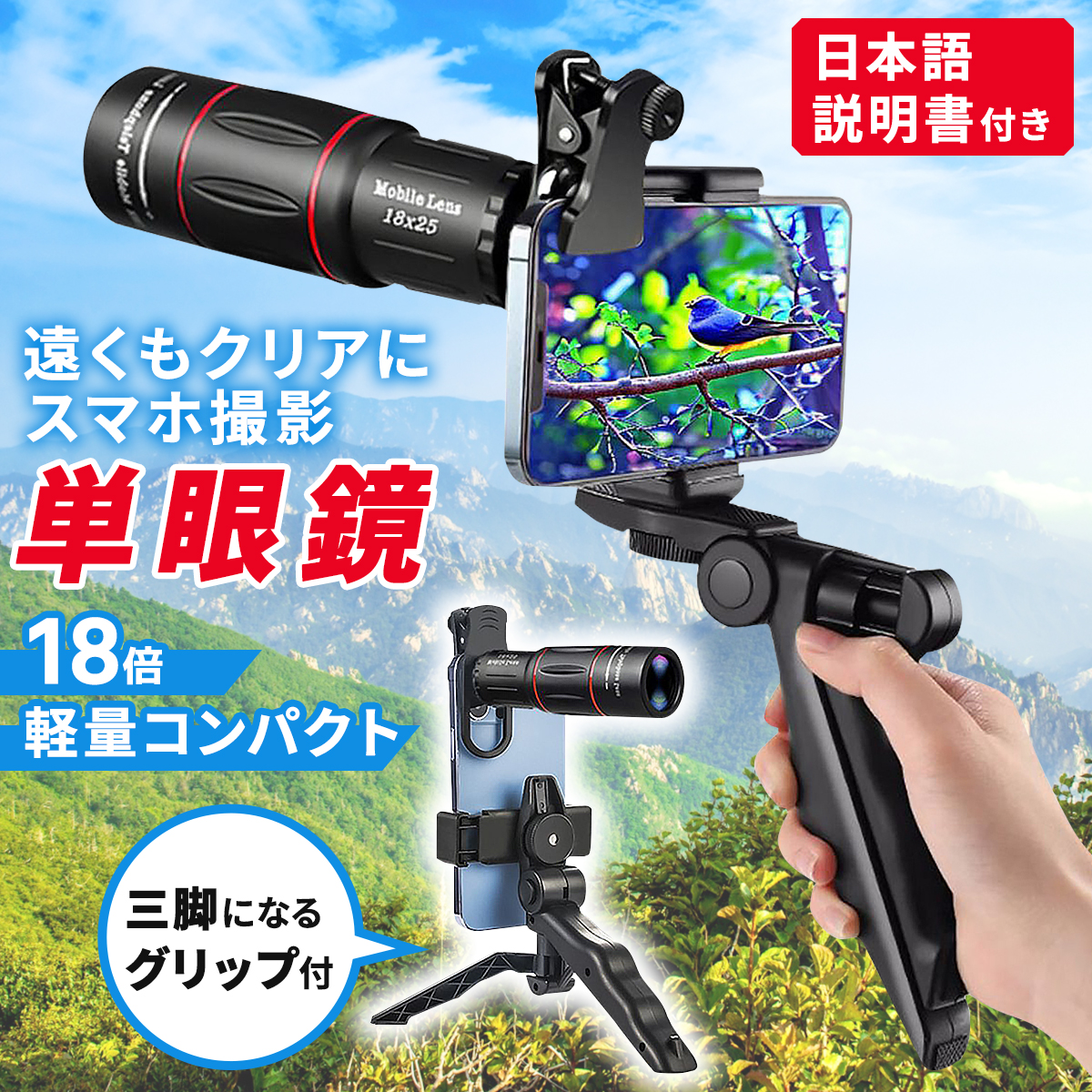 商品名:単眼鏡 望遠鏡 単眼望遠鏡 高倍率 スマホ バードウォッチング コンサート ライブ コンパクト アダプター 三脚付き 18倍