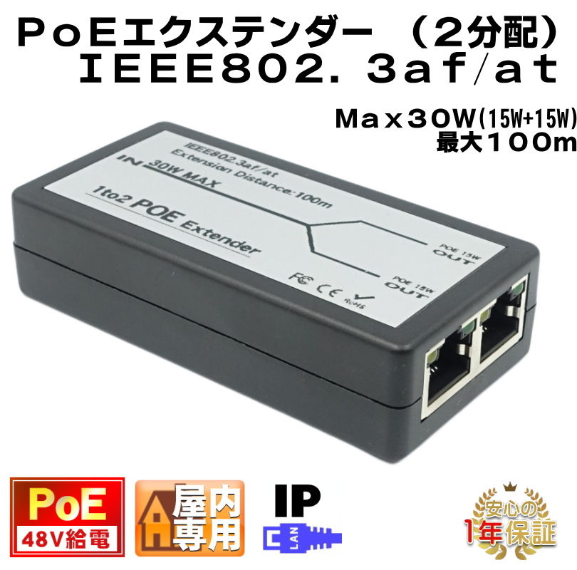 PoE 2分配エクステンダー 1入力2出力 Max100m 100Mbps 48V 15Wx2 IEEE802.3af KC-12793