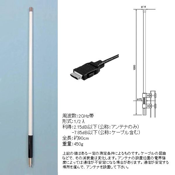 | アンテナ利得 | 2.15dBi 以下(公称:アンテナのみ)、 約-3dB以下(公称:ケーブル10m含む) | |