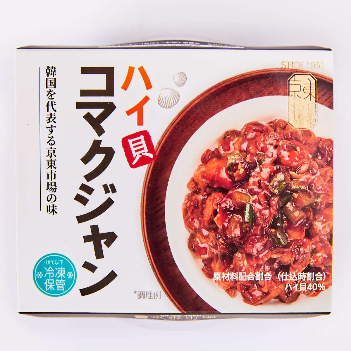 ●名称:コマクジャン(ハイ貝煮)●原材料名:ハイ貝煮、にんにくの芽、水飴、ソース(果糖、酒精、米、糖蜜)、にんにく、醤油、玉ねぎ、唐辛子粉、ねぎ、砂糖、しょうが、魚醤、植物油脂、ごま、こしょう/調味料(アミノ酸等)、増粘剤(キサンタン)、pH調整剤、甘味料(ステビア)、(一部に小麦・ごま・大豆を含む)●内容量:80g●賞味期限:2年●保存方法:要冷凍(-18℃以下)で保存してください●凍結前加熱の有無:加熱してあります●加熱調理の必要性:加熱の必要はありません●原産国名:韓国●輸入者:ケイディーマーケットジャパン(株)東京都新宿区新宿1-12-9-201