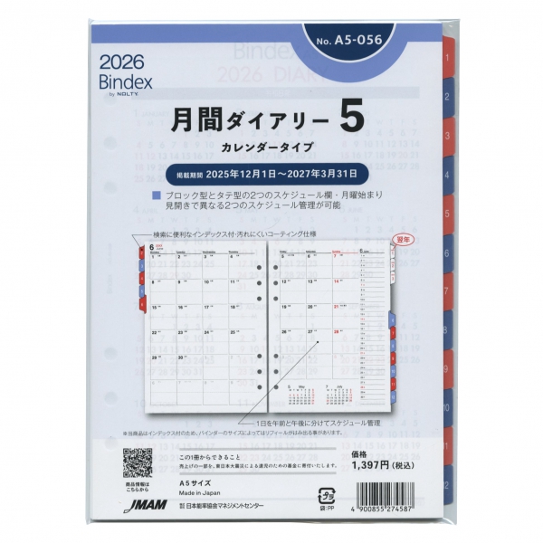 2026年 A5サイズ 月間ダイアリー5 カレンダータイプ システム手帳リフィル A5056