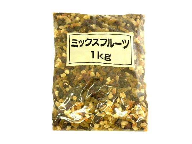 製品特性:パインダイス、パパイヤダイス、グリーンレーズン、クランベリー、レーズンを各20%ずつ混合した商品で、色合いがよく、手軽に生地等に混ぜてご使用いただけます。