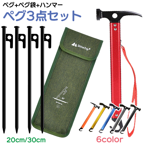 ペグ 選べる 3点セット ハンマー 袋 20cm 30cm 8/12/16本 ペグ袋 ハンマー セット ショートペグ 鍛造 キャンプ アウトドア ソロキャン カラー ソリッドステーク