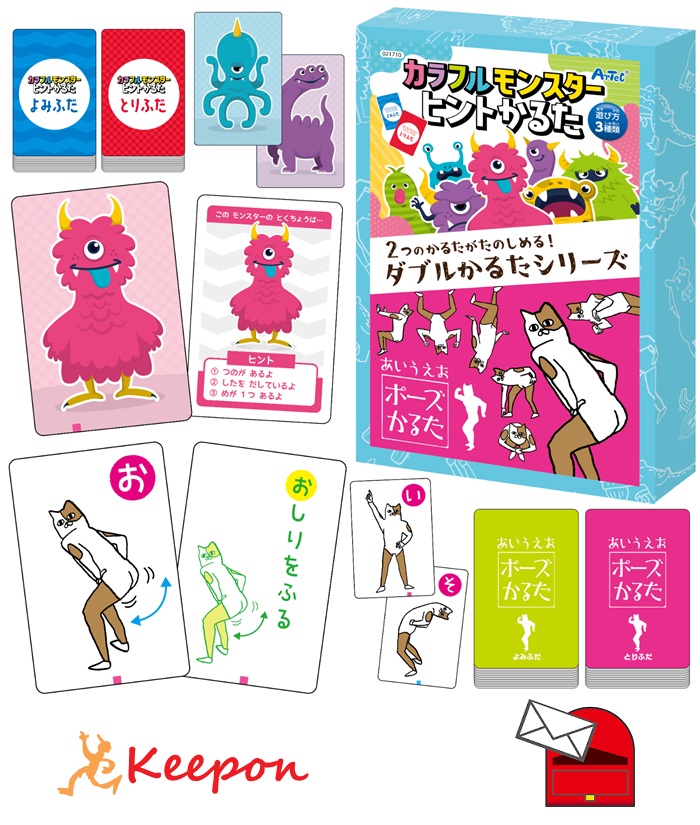 カラフルモンスターヒントかるた(取り札×45、読み札×45、予備×4、説明カード×6)×1、あいうえおポーズかるた読み上げアプリ付き(取り札×46、読み札×46、予備×6)×1