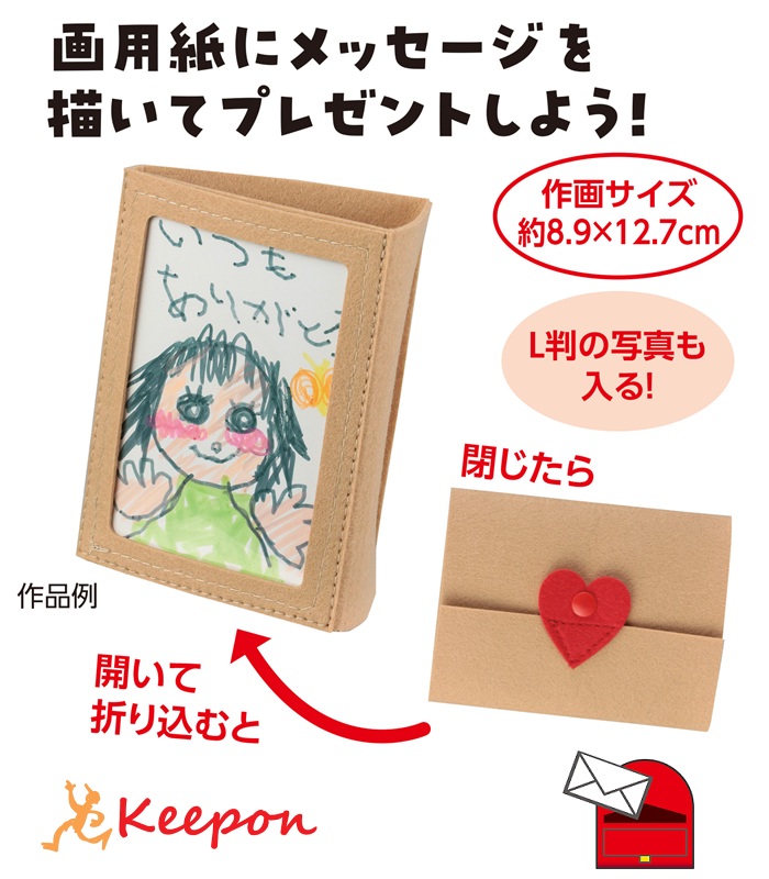 付属の画用紙にメッセージを描いて大切な人へのプレゼントとして利用できるほか、L判サイズの写真を飾ることもできます。