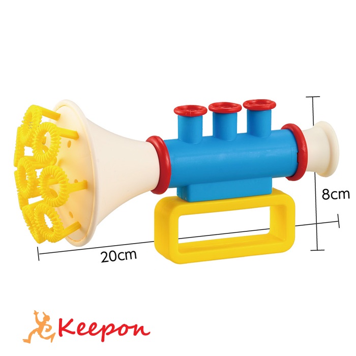 吹くだけでシャボン玉が飛び出す、カラフルでポップなラッパ型おもちゃです。