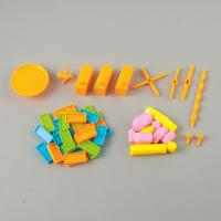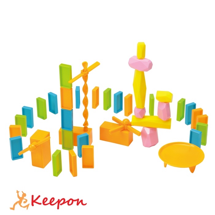 ドミノ牌(オレンジ)×9、ドミノ牌(ブルー)×9、ドミノ牌(グリーン)×9、ブロック×10、スピナー台×1、スピナー×1、風車台×3、風車A×2、風車ピン×2、風車B×1、風車棒×1
