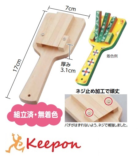 バチがはずれないよう、釘で補強しました。組立済のなるこです。裏、表に3連のバチが付、とてもよく鳴ります。