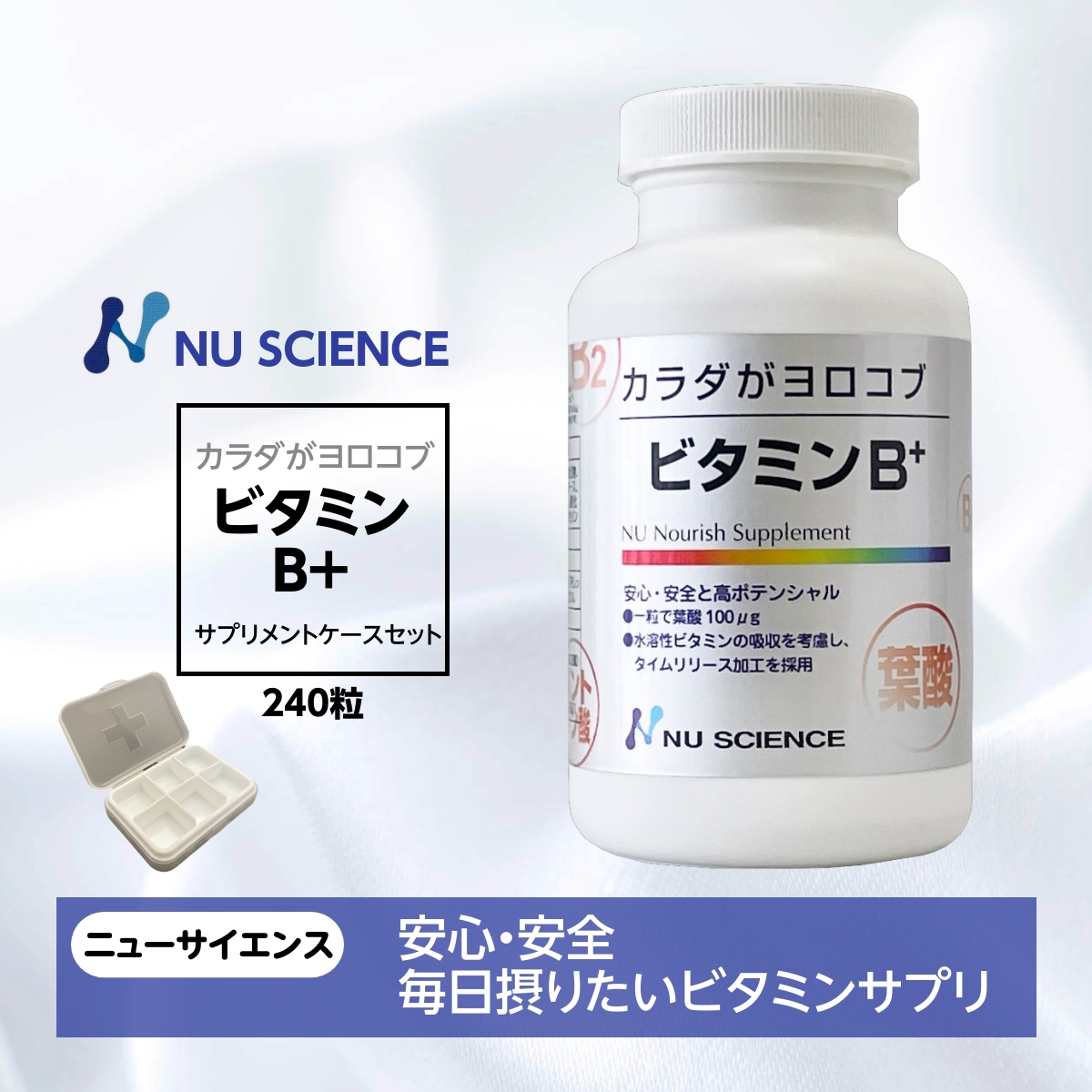 栄養表示 4粒(2.5g)当たり: エネルギー 8.6kcal タンパク質 0.5g 脂質 0.2g 炭水化物 1.2g 食塩相当量 0.02g ビタミンB1 100mg、ビタミンB2 100mg、ナイアシンアミド 100mg、パントテン酸 100mg、ビタミンB6 100mg、ビタミンB12 100μg、ビオチン 100μg、葉酸 400μg、イノシトール 200mg、コリン 40mg