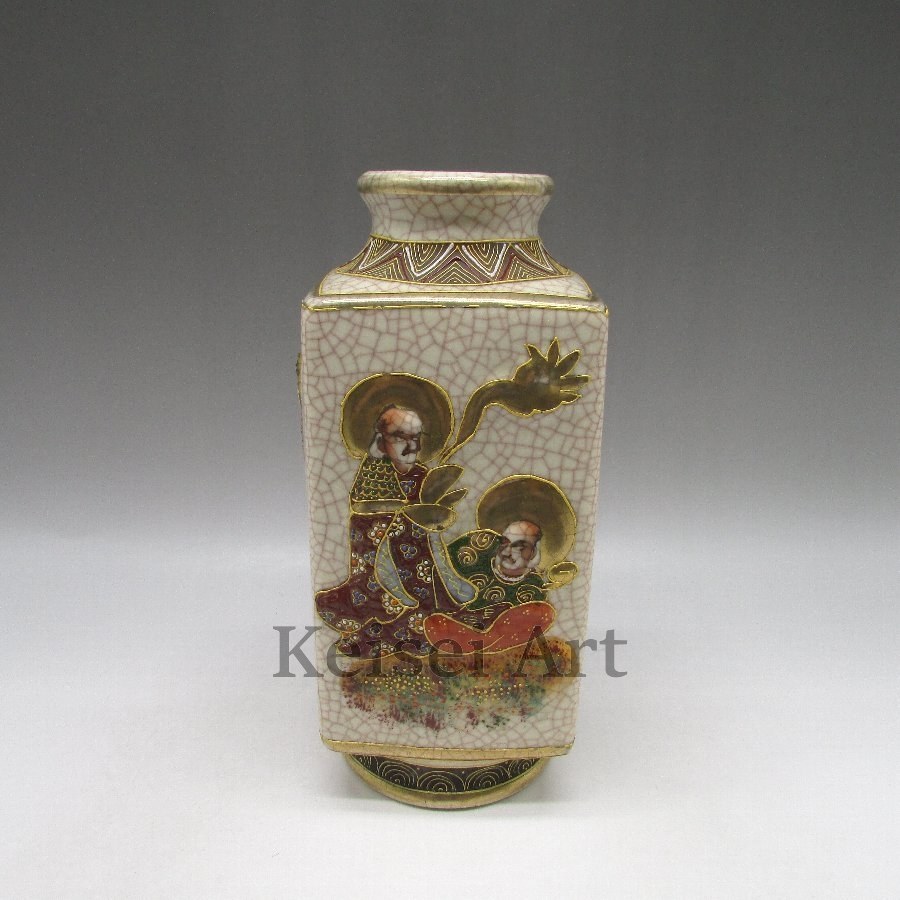 薩摩焼のモールド人物文花瓶です。明治・大正時代に欧米に輸出されたものが、約100年の時を経て日本に里帰りしてきました。これらは「里帰り陶磁器」又は「里帰り品」として、現在では再現不可能と言われている高い技術や装飾性などから世界中から再評価されており、美術工芸品としての地位を確立しています。薩摩焼以外にもオールドノリタケ、隅田焼、横浜焼、瀬戸焼、有田焼、九谷焼等多くの名品が海を渡っていました。