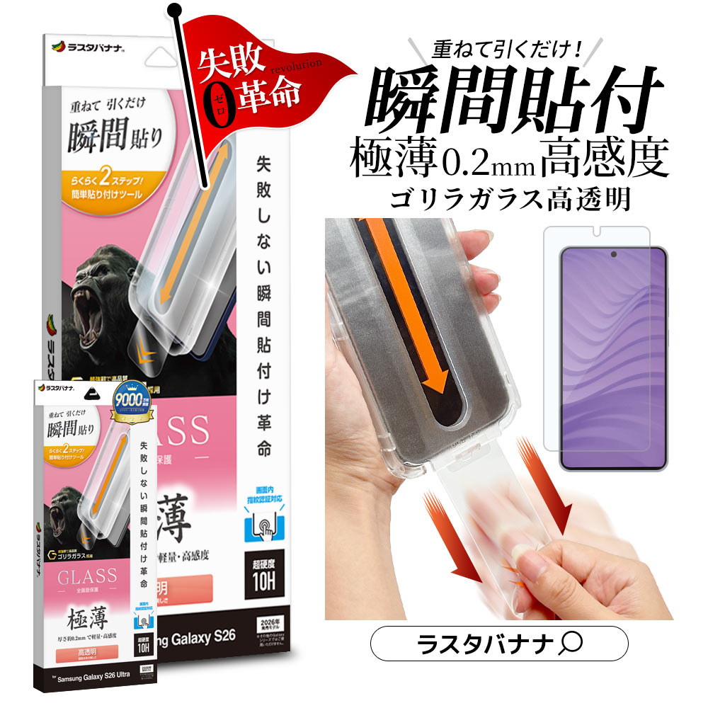 Galaxy S26 S26 Ultra ガラスフィルム 全面保護 高光沢 高透明 クリア 薄型 高感度 ゴリラガラス採用 0.2mm 瞬間貼り ギャラクシー 保護フィルム ラスタバナナ