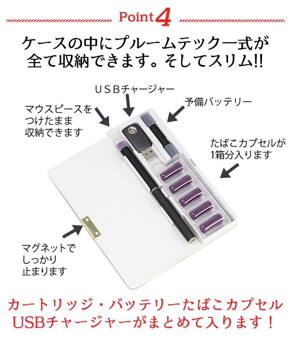 ・プルームテックのカートリッジ、バッテリー、たばこカプセル、USBチャージャーをまとめて携帯できます。 マウスピースをつけたまま収納が可能です。