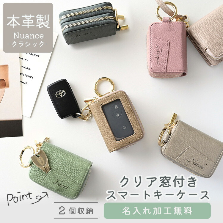 商品名:スマートキーケース ダブル クリア窓付き 名入れ【 本革 Nuance -クラシック- 】 シュリンクレザー キーケース くすみカラー ナチュラルカラー ニュアンスカラー レディース メンズ 大人かわいい おしゃれ カラビナ付き キーレス 車 通勤 通学