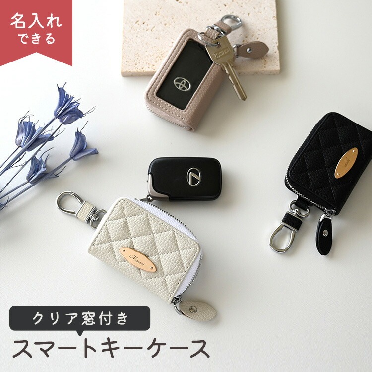 スマートキーケース 窓付き シングル オーバルプレート キルティング simple 名入れ クリア窓付き くすみカラー レディース メンズ キーレス メール便送料無料