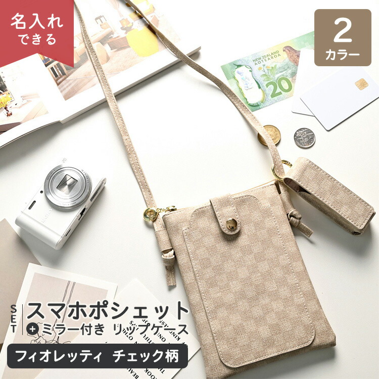 福袋 スマホポシェット フィオレッティ チェック柄 1本収納 ミラー付き リップケースセット 名入れ スマホショルダーバッグ スマホケース メール便送料無料