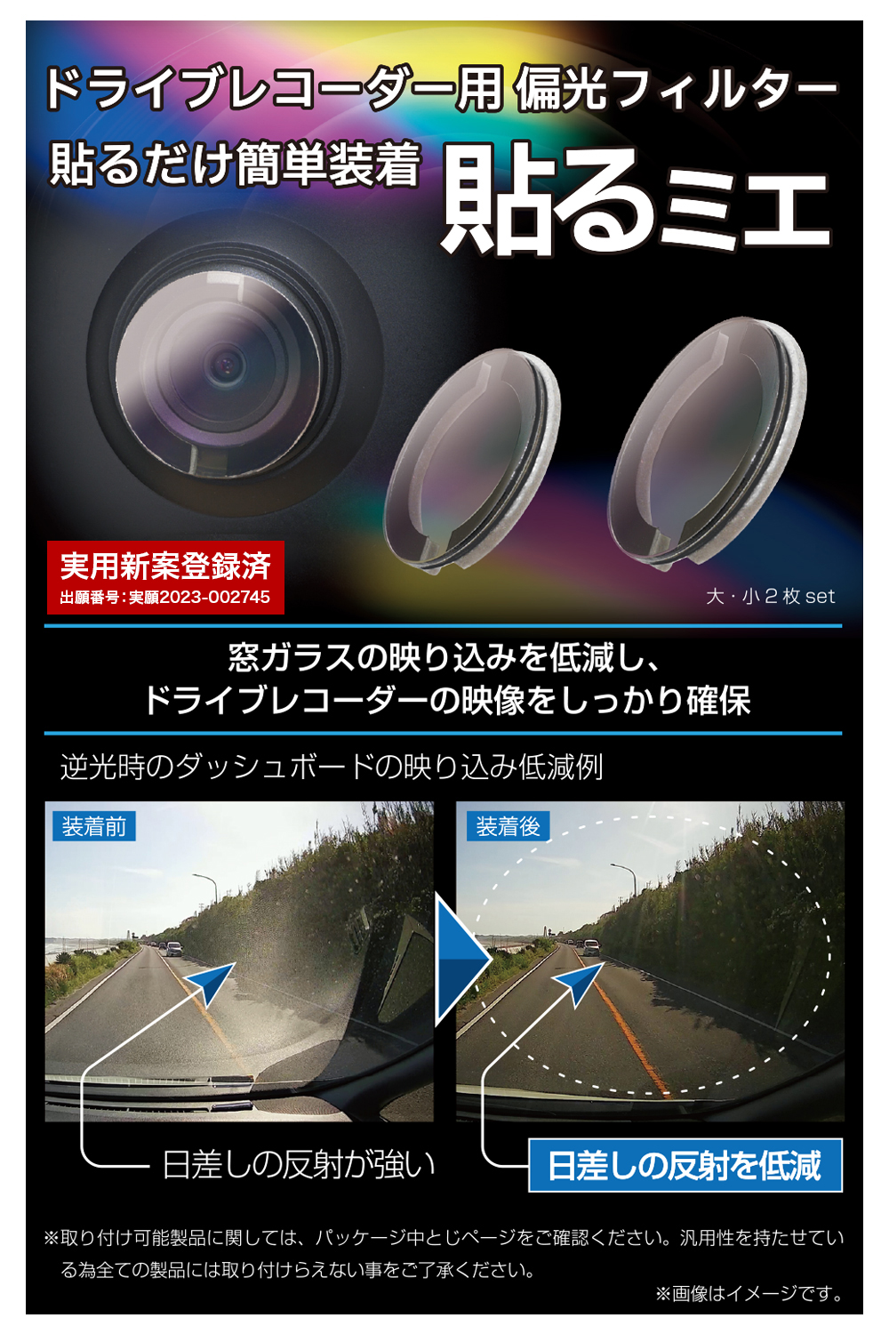 弊社の偏光フィルター「貼るミエ」は実?新案登録済で、偏光フィルムの効果を最低限発揮できるよう に加工し、ドライブレコーダーのカメラレンズ部へ簡単に装着できる製品です。