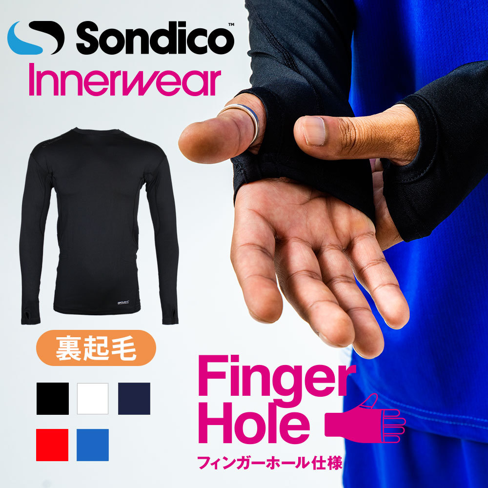 イギリスの伝統あるサッカー専門ブランド・ソンディコのロングスリーブインナーシャツ。丸首仕様。冬でも暖かい起毛タイプ。手の甲で受ける冷たい風を避けながらも指先は自由になる、フィンガーホール仕様。脇下メッシュ構造により衣服内のムレを解消。
