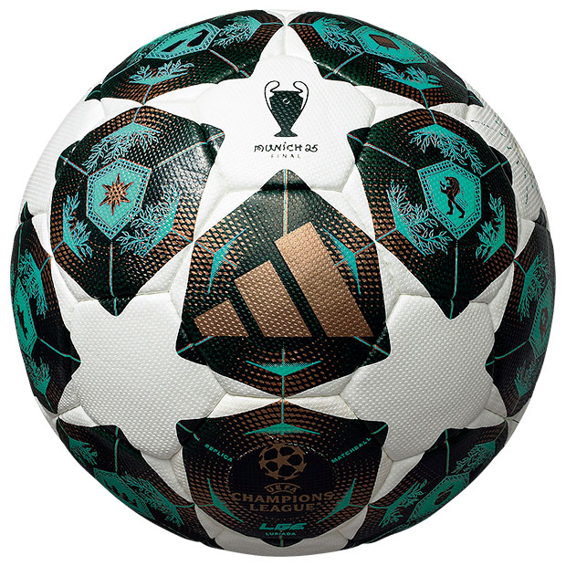 「UEFA チャンピオンズリーグ 24-25(UEFA Champions League 2024-2025) ノックアウトフェーズ」で使用される公式試合球のレプリカボール。決勝の開催地・ミュンヘンの街並みをイメージするグリーンと、ミュンヘンを象徴するアイコンをデザインに採用。