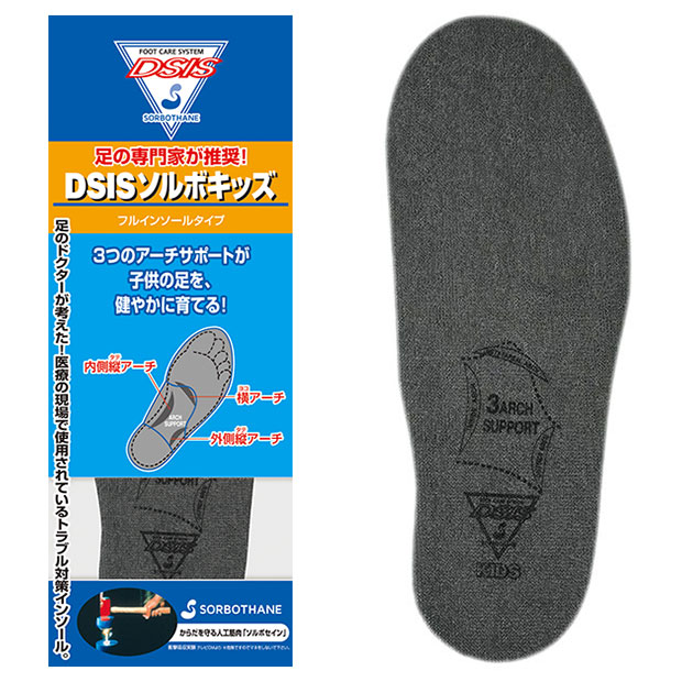 足の健全な発育の為に。上履きや日常履き向けインソール。成長期の子供の足にかかる負担を、衝撃吸収素材「ソルボセイン」と、3つのアーチサポート機能で軽減。土踏まずのアーチをしっかり守り、かかとにかかる衝撃を分散するとともに、足指をしっかり使うことでスムーズな体重移動が行え、正しい歩行をサポート。