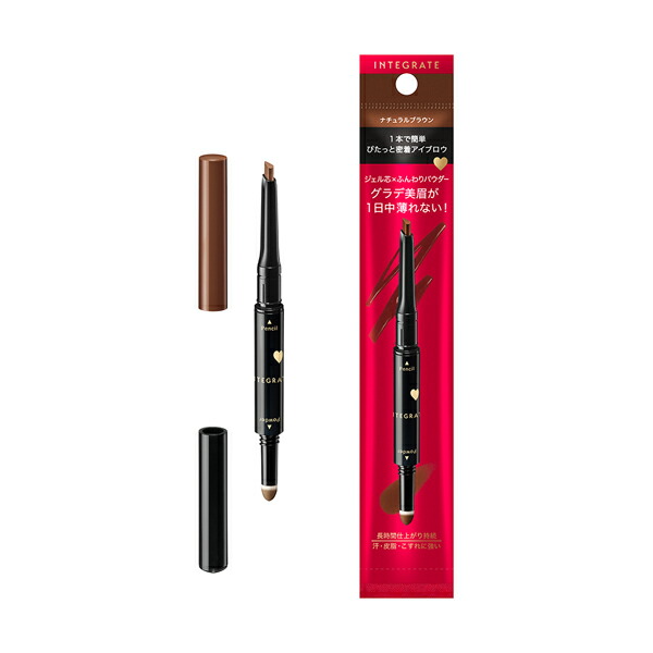 【商品説明】 簡単2ステップ。密着するから薄れにくいジェル生まれのペンシルと、ふんわりパウダーでグラデ美眉が1日中*続くダブルエンドアイブロウ。 汗・皮脂・こすれに強いプルーフ・スマッジプルーフ。 *13時間仕上がり持続テスト済み(メーカー調べ。効果には個人差があります。)【使用方法】●「ペンシル」の芯を2mmほど繰り出して、眉毛の足りない部分を描き足します。 ●「パウダー」はチップをキャップの奥まで差し込み、左右に数回まわしパウダーを含ませ、眉頭から眉全体に、ぼかしなじませます。【使用上の注意】◇乳幼児の手の届かないところに置いてください。 ◇日のあたるところや高温・多湿のところに置かないでください。 <ペンシルのご注意> ◇出しすぎると折れることがありますのでご注意ください。 ◇ご使用後は芯を繰り戻し、キャップを閉めてください。 ◇芯の出しすぎや落下などの衝撃により折れることがありますのでご注意ください。 <パウダーのご注意> ◇初めてお使いになるときや、パウダーのつきが悪い場合は、チップをキャップの奥まで差し込み、左右に数回まわしてパウダーをしっかり含ませてからお使いください。 ◇チップを肌に強く押しつけると、チップが傷んだり切れたりしますのでご注意ください。 ◇チップに皮脂やファンデーションなどが付着し、描きにくくなった場合は、ティッシュペーパーなどでよく拭き取ってからお使いください。 ◇ご使用後は必ずキャップをきちんと閉めてください。 ◇チップは洗わないでください。【原産地】 日本
