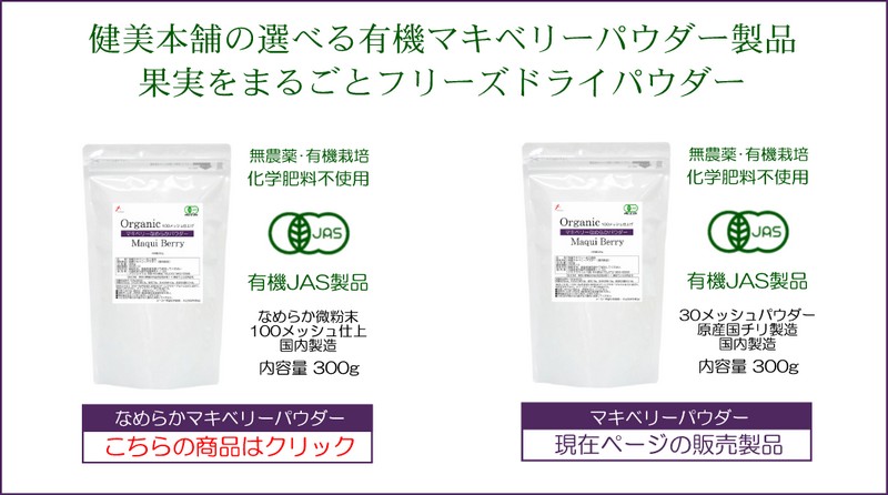 | 【スーパーフード マキベリーはポリフェノール宝庫】 マキベリーは南米チリ南部のパタゴニアの山奥で自生しているので希少性 が高く、寒暖差が激しい過酷な環境で育つためファイトケミカルであるポリフェノール(特にアントシアニン)を豊富に蓄えていてます。古くから原住民のマプチェ族によって自生地の管理、果実の収穫が行われ原住民は聖なる木として大切にされてきました。マキベリーは高さ3〜5mの雌雄異体植物です。果実は6mm位の球体で色は艶のある黒色で完熟するのは1月から3月までの僅か3ヶ月です。収穫時期によりマキベリーパウダーのお色や風味に違いが御座います。マキベリーはパタゴニアンブルーベリーとも言われてパダゴニアのスーパーフルーツと言われています。果汁はほのかに甘く 美しい 深紫色をしていて現地ではジュースやジャム、ワインに利用されているほかに天然染料としても使われています。 【スーパーフード マキベリーの優れた機能性】 マキベリーが長きに渡りスーパーフードしての人気を保ち続けているのでしょうか。クラブスマイルでマキベリーの取り扱いを始めさせて頂いたのが2016年10月ですので、約7年の取り扱いがございますが人気も色褪せることになく継続したご注文を頂いている人気商品です。おそらくマキベリーには使用することで得られる満足感や体感が大きいのではないかと思われます。マキベリーがスーパーフードであるゆえんはマキベリーに含まれるポリフェノールの含有量とその良質のポリフェノールの機能性だと考えています。 【健美本舗 有機JAS マキベリーフリーズドライパウダー】 健美本舗のマキベリーは大自然の中で自生している天然マキベリー果実のみを使用しています。日本の有機JAS規格認定のマキベリーパウダーを使用しております。当然のことですが農薬や化学肥料は使用されておりません。純度100% 無農薬・無着色・無香料のマキベリーパウダーです。健美本舗のマキベリーパウダーはマキベリーの果実を丸ごとフリーズドライパウダーに仕上げておりますので種子なども含まれており、本来のスパーフードとしてマキベリー丸ごとの養素をお楽しみください。 健美本舗のマキベリーは日本の有機JAS規格の認定基準をクリアした製品です。自生している天然のマキベリーを使用しておりますので農薬・化学肥料などを一切、行わずにお手頃なお値段で有機JASマキベリーをご家庭にお届けしています。 【健美本舗のマキベリー選べる2タイプご用意しました】 健美本舗ではマキベリーパウダー製品の取り扱いは2016年10月で約7年の取り扱いがございます。 マキベリーパウダーの取り扱いは現地から輸入される20メッシュ程度の少し粗めのパウダーでの販売を開始しました。ご提供できるお値段にも魅力を感じて頂き順調な販売を続けてきました。その後、現地から送られてくるマキベリーパウダーの粗めのパウダーですとマキベリーの種の質感がザラザラと感じられ、ヨーグルトなどに混ぜたときに特にザラザラ感を強く感じることがあり、もう少しなめらかなパウダーのマキベリーパウダーが有ればと思っておりましたところ仕入れ先の担当者とも何度か話をしておりました。その甲斐もあり仕入れ先よりマキベリーパウダーを日本国内でなめらかな100メッシュに加工したマキベリーパウダーの提案を頂くこととなり種のザラザラ感がない、なめらかなマキベリーパウダー製品の販売をスタートしました。 日本国内で100メッシュに加工されたなめらかなマキベリーパウダーの特徴は、種子の粗く砕かれたザラザラとした感じなくなり、ご提供できるお値段も味方して多くの固定ユーザー様にご愛用頂けるマキベリー製品としてご紹介を取らせて頂いておりました。日本国内で100メッシュに加工されたマキベリーパウダーの特徴としましてはそのパウダーのなめらかさです。スムージー、ヨーグルト、ジュース等、何に混ぜても違和感なくご使用いただけます。ただ、マキベリーは直径6mm程度の小さな果実ですが種子はそこそこ大きいのが特徴です。粗めのメッシュでしたら種子が細かく砕かれたような状態で決してパウダー状では無いのが特徴の為、種子の風味が干渉されません。なめらかにすることは種子まで100メッシュに細かく粉砕することで種子も果肉も区別されることなく粉末になります。風味に違いが存在するのです。健美本舗ではマキベリーパウダーのリニューアル製品としましては日本国内の有機JAS規格に準じた有機JAS製品でのご紹介になりました。また、2タイプのマキベリー パウダーをご用意させて頂きました。1つ目は現地の南米チリのパタゴニア地方から輸入されてきた有機JAS規格マキベリーFDパウダーを日本国内の有機JAS認定機関でパック詰めをおこなった「有機JAS規格 マキベリーフリーズドライパウダー 300g」と2つ目は現地の南米チリのパタゴニア地方から輸入されてきた有機JAS規格マキベリーFDパウダーを日本国内の有機