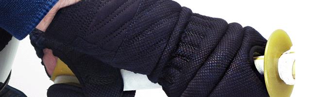 | 甲手布団は、打たれる竹刀とステッチが直角になるように縫製しております。 また、独自の間隔でステッチを入れることで衝撃を受ける甲手布団に凹凸(オウトツ)をつくり 衝撃を分散させております。 その結果、甲手打ちの打突の衝撃を和らげることに成功いたしました。 | ||||